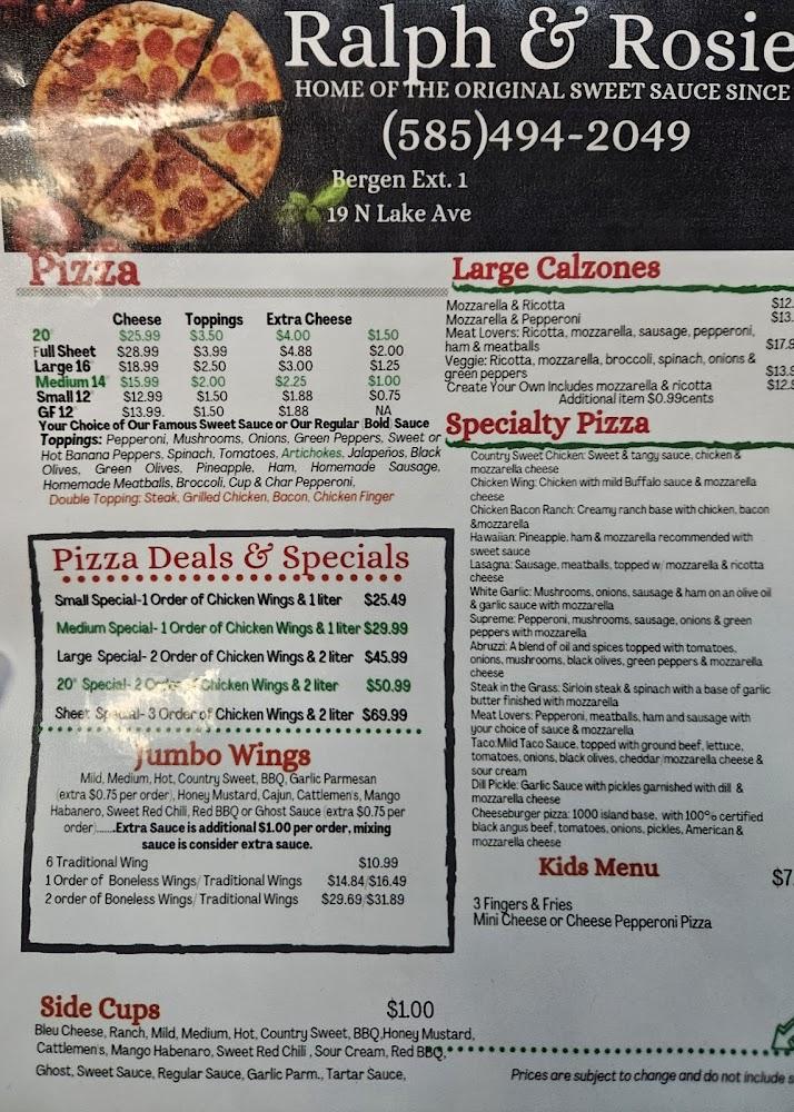 Menu and prices subject to change. Contact +1 585-494-2049 for confirmation.